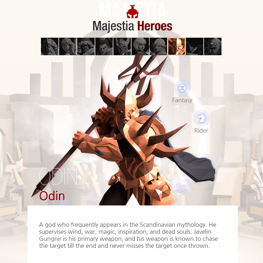 นอกจากนี้ ฮีโร่แต่ล่ะตัวจะมีเอกลักษณ์เป็นของตัวเอง และมีชื่อตำนานที่หลายคนคุ้นเคย เช่น โพไซดอน กษัตริย์อาเธอร์ Genghis Khan และแม้กระทั่ง Lu Bu และอื่น ๆ จะแผ่กระจายไปทั่วยูเนี่ยน Majestia เป็นเกม RTS ที่ให้ความหลากหลายของการต่อสู้เชิงกลยุทธ์กับการรวมกันของสกิลต่าง ๆ เพื่อน ๆ สามารถติดตามรายละเอียดเพิ่มเติมได้ที่หน้าเว็บไซต์ลงทะเบียนล่วงหน้า