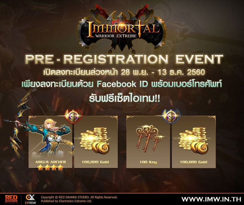 หลังจากเปิดตัวแบบอลังการในงาน TGSBIG 2017 เมื่อต้นเดือนพฤศจิกายนที่ผ่านมาสำหรับเกม Immortal Warrior Extreme สุดยอดเกม Action RPG Strategy บนมือถือจากผู้ให้บริการ Electronics Extreme ก็ได้ฤกษ์เปิดให้ผู้เล่นที่สนใจเข้ามาลงทะเบียนล่วงหน้ากันได้ตั้งแต่วันนี้ จนถึงวันที่ 13 ธ.ค.นี้ โดยผู้ที่ลงทะเบียนล่วงหน้าไว้จะได้รับฟรีเซ็ตไอเทมมูลค่ากว่า 1,000 ในช่วงที่เกม Immortal Warrior Extreme เปิดให้บริการ และ ยิ่งไปกว่านั้นยังได้มีสิทธิ์ลุ้นรับ IPhone X จำนวน 1 เครื่อง