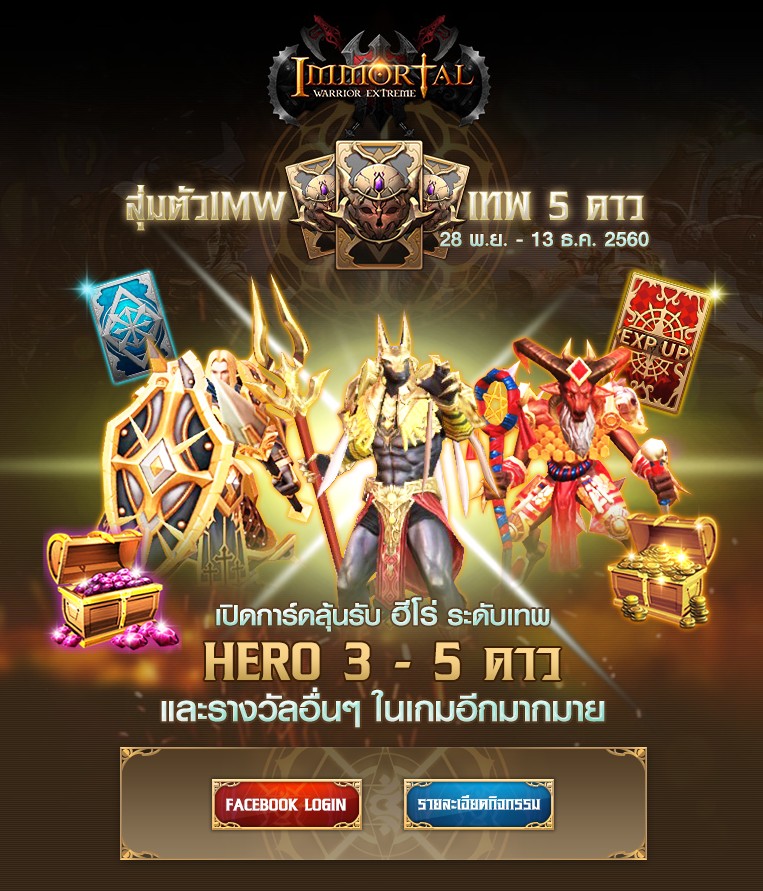 นอกจากนี้ยังมีกิจกรรม “สุ่มตัว IMW เทพ 5 ดาว” ให้ผู้เล่นสามารถเข้าไปร่วมเล่นกิจกรรมสุ่มเปิดการ์ดลุ้นรับ Hero 3-5 ดาว พร้อมทั้งมีโอกาสลุ้นรับไอเทมสุดพิเศษอื่นๆได้อีกมากมาย ซึ่งเกม Immortal Warrior Extreme จะเปิดให้ดาวน์โหลดเกมในเร็วๆนี้ใครที่สนใจสามารถเข้าไปลงทะเบียนล่วงหน้ารอได้เลย