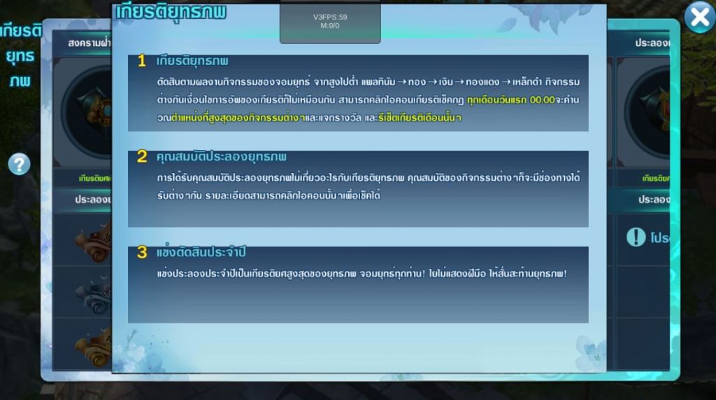 เงื่อนไขกิจกรรม : หลังจากอัพเดทแพทช์และตัวละครเลเวล 60 ขึ้นไป จะมีเมนู “เกียรติยุทธภพ” ขึ้นมาตามกรอบแดงในรูป