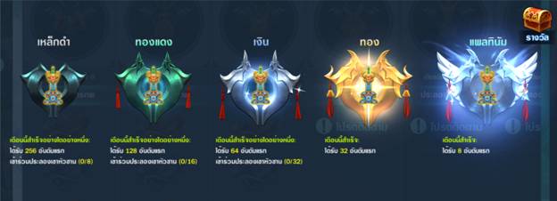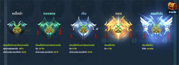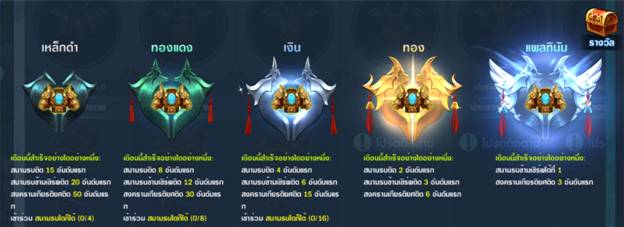 เมื่อเรากดเข้ามาแล้วจะเจอแล้วเหรียญตราต่าง ๆ เช่น เกียรติเหล็กดำ เกียรติทองแดง เกียรติเงิน เกียรติทอง และ เกียรติแพลทินัม ซึ่งเงื่อนไขและของรางวัลแต่ละเหรียญตราจะแตกต่างกันไปด้วยนะ เมื่อเราจบกิจกรรมต่างๆและผ่านเงื่อนไข จะเด้งเหรียญตราที่เราผ่านเงื่อนไขที่หน้าจอเลย