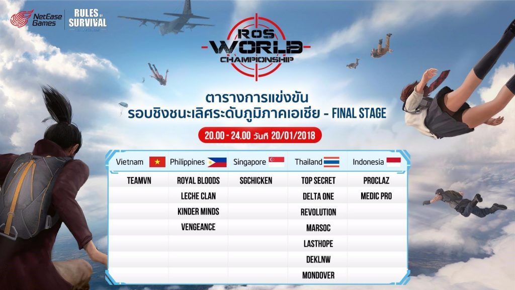 ผ่านไปแล้วกับการแข่งขันรอบคัดเลือกเกมส์ RoS หรือ Rules of Survival ในรายการระดับโลกอย่าง “RoS World Championship” สำหรับรอบคัดเลือกโซนเอเชียทีมจากประเทศไทยผ่านเข้าสู่รอบ The Grand Final ถึง 7 ทีมจาก 15 ทีม ซึ่งจะต้องไปตัดสินกันในรอบถัดไปวันที่ 20 มกราคม สามารถติดตามการ live สดการแข่งขันได้ทางหน้าแฟนเพจ Rules of Survival