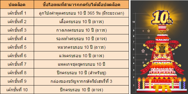 เค้กฉลองครบรอบ 10 ปีนี้ จะมีทั้งหมด 10 ชั้น เมื่อผู้เล่นทั้งเซิร์ฟเวอร์ร่วมแรงร่วมใจกันเก็บไอเทม “ครีมสด” ที่ดรอปจากสนามต่างๆ (ยกเว้นอานูบิส) เพื่อนำมาทำเป็นเค้ก จนครบในแต่ละชั้น ก็จะมีรางวัลประจำชั้นต่างๆ ยิ่งวิ่งมาก ก็ยิ่งได้มาก ยิ่งชั้นเค้กยิ่งสูง ไอเทมก็ยิ่งแรร์ขึ้นตามไปด้วย แถมยังมีของรางวัลตอบแทนทุกครั้งที่ทำการส่งครีมสดให้ด้วยละ