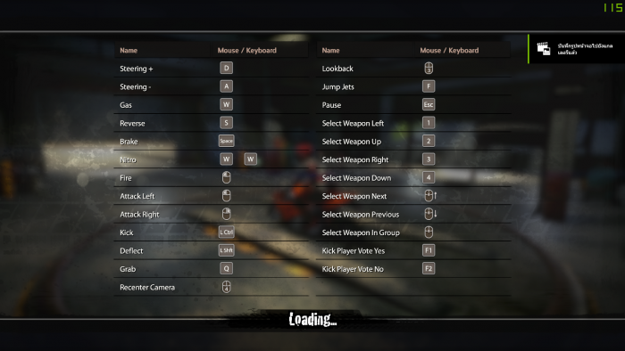 หลังจากนั้นจะเป็นการเลือกสนามแข่ง เพื่อเข้าสู่เกม ในช่วงรอโหลดจะมีหน้าจอแสดงทริคต่างๆ ให้ด้วยนะครับ ซึ่งอันที่ผมแคปมาได้คือปุ่มค่ำสั่งต่างๆ ในการควบคุมรถจะใช้แป้นพื้นฐาน W A S D ส่วนเมาส์จะใช้ในการหมุนกล้องในจอเกม และกดคลิกคำสั่งต่างๆ เช่น คลิกซ้าย เพื่อใช้ไม้ตีหัวนักแข่งที่อยู่ทางด้านซ้าย