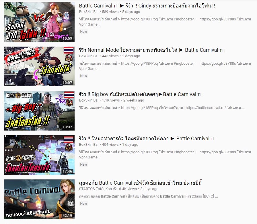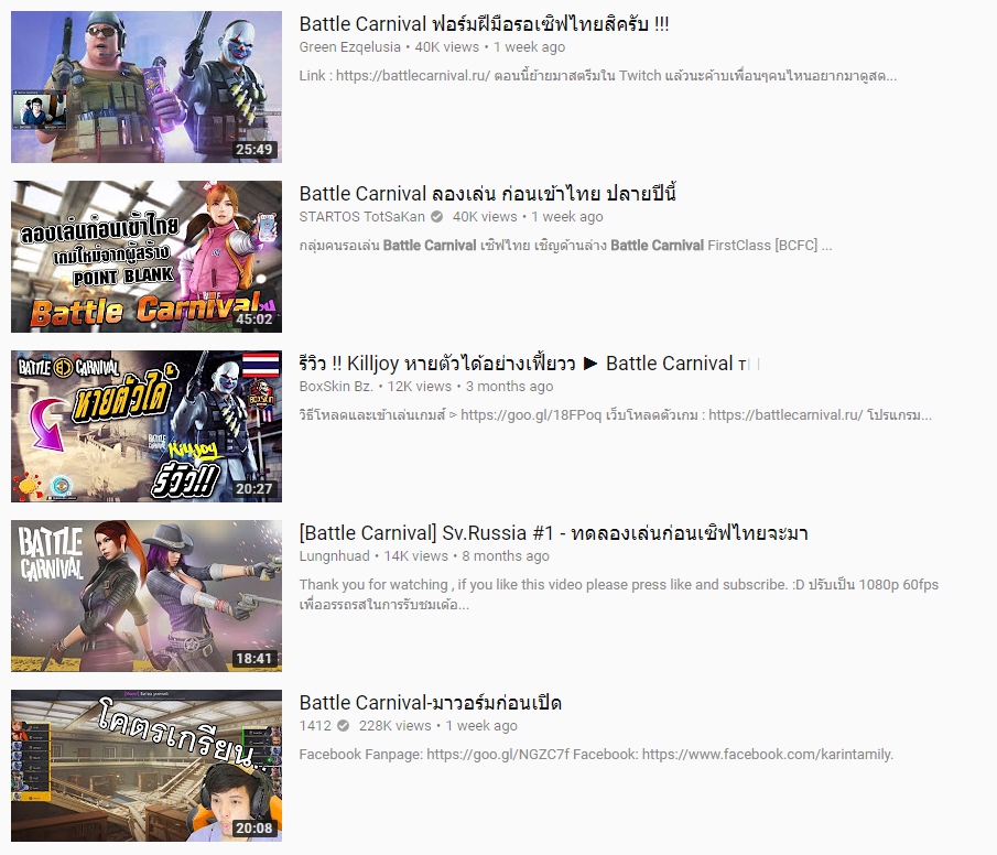 หลังจากที่ช่วงนี้เห็นข่าวคราว ภาพวีดีโอ และ ภาพของเกม Battle Carnival จาก Facebook Fanpage ที่ปล่อยออกมาเรียกน้ำย่อยให้ผู้เล่นได้คอยตามติดตามอัพเดทข่าวสาร และ ทำความรู้จักกับตัวเกม Battle Carnival กันมากขึ้น นอกจากจะมีเหล่าเกมเมอร์คอยถามถึงเวลาเปิดเกม และ รอเล่นอยู่นั้น ก็มีเหล่าแคสเตอร์มากมายที่อดไม่ไหว ขอตบเท้าเข้าไปฝึกฝีมือพรางๆ พร้อมโชว์ความเทพในเซิร์ฟรัสเซียก่อนที่เกมนี้จะเข้าไทย จนเยอะขนาดที่ว่าพอพิมพ์ชื่อเกม “Battle Carnival” เข้าไปใน Youtube ก็จะพบกับวีดีโอรีวิวเกมจากบรรดาแคสเตอร์ชื่อดัง ที่ทำไว้ให้ผู้เล่นได้รับดูรับชมกันอย่างมากมาย