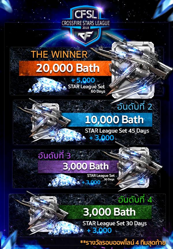 สำหรับการแข่งขันรายการ CROSSFIRE STARS LEAGUE 2018 ครั้งนี้จะเป็นการแข่งขันแบบ Single Elimination โหมด Bomb match วางระเบิด 5 Win ไปกลับสลับฝั่ง โดยจะ อนุญาตให้ใช้อาวุธได้ทุกชนิดที่มีระดับสีเทา, สีฟ้า, สีเขียวเท่านั้น โดยจะแข่งขันคัดเลือกรอบออนไลน์เริ่ม 15 ม.ค. 61 หา 4 ทีมสุดท้ายไปแข่งกันต่อในรอบ Offline ในที่ 27 ม.ค. 61 ร้าน MC Academy ที่ BIG ราชดำริ ชั้น 5 ไปดูในส่วนของเงินรางวัลของทัวร์นาเม้นต์นี้กันเลย ใครที่ยังไม่ได้โหลด CF-CROSSFIRE รีบโหลดมาฝึกฝีมือกันเลย!