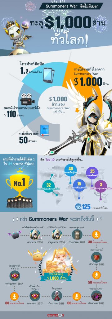 - เกม Summoners War กวาดรายได้ทั่วโลกกว่า 1 พันล้านดอลลาร์ พิสูจน์ให้เห็นแล้วว่าเกมได้รับความนิยมอย่างล้นหลามตลอดช่วง 3 ปีของการให้บริการที่ผ่านมา